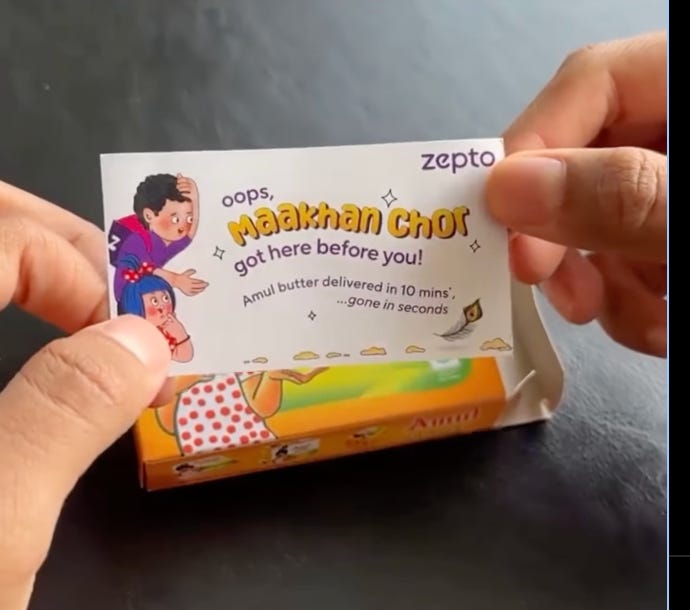 Tiny stunt, huge cultural fit. Zepto and Amul teamed up for a perfect little surprise: regular grocery orders that included the Amul butter cover box — but inside it was empty. Instead of butter there was a card that read: “oops, Maakhān Chor got here before you!”